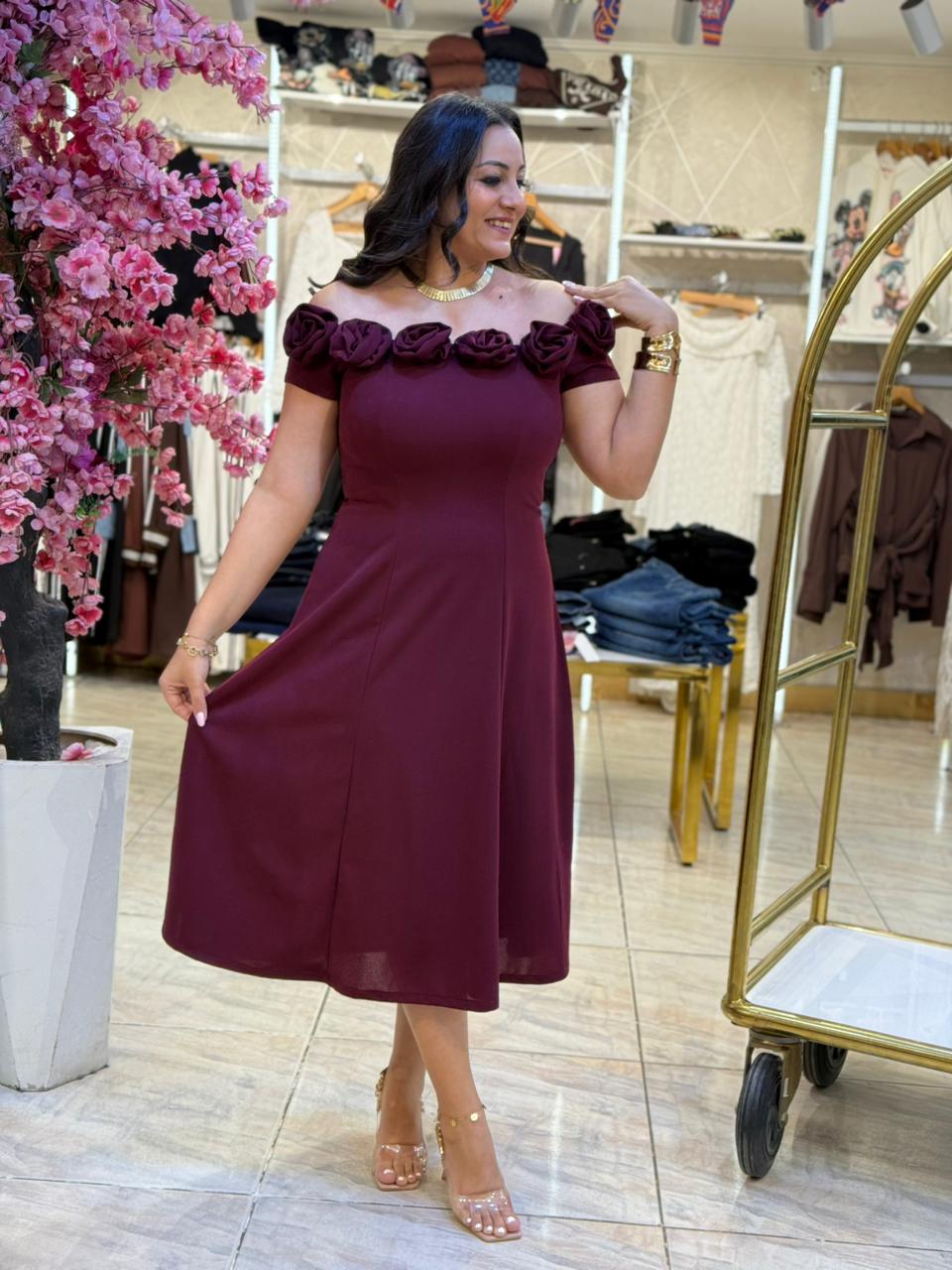 Off Shoulder Plain Color Front Flowers Long Dress