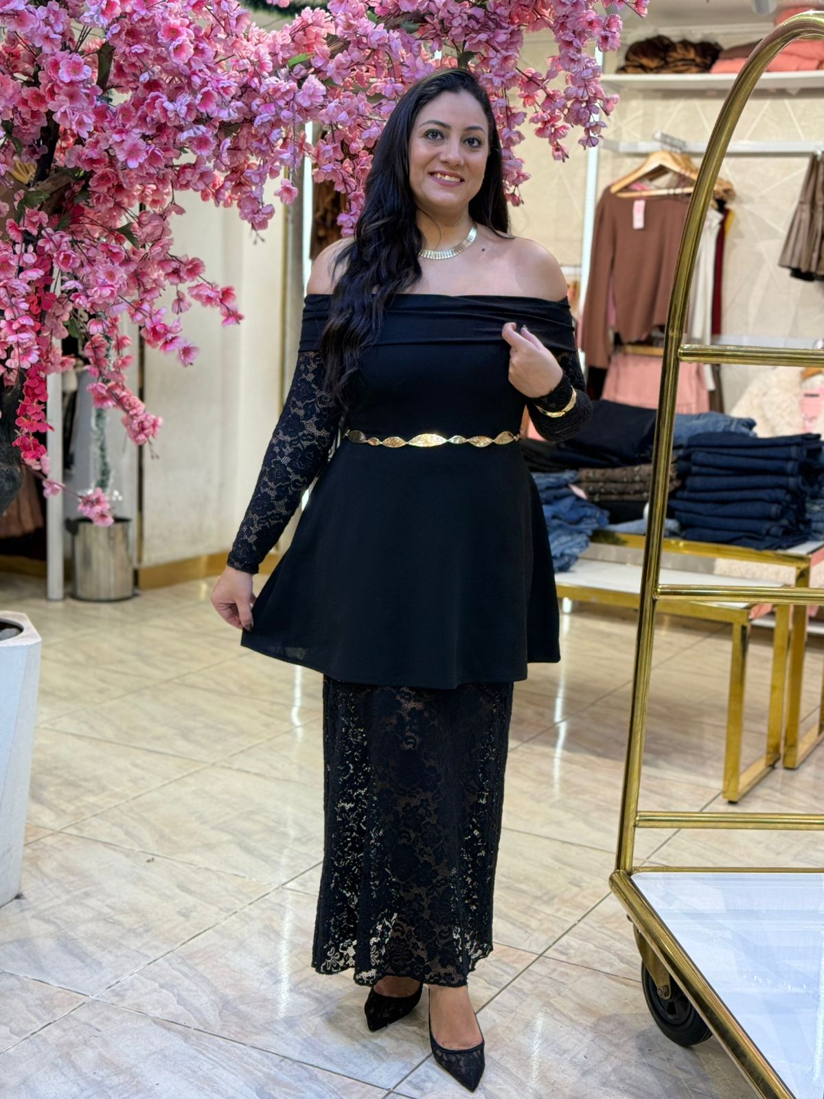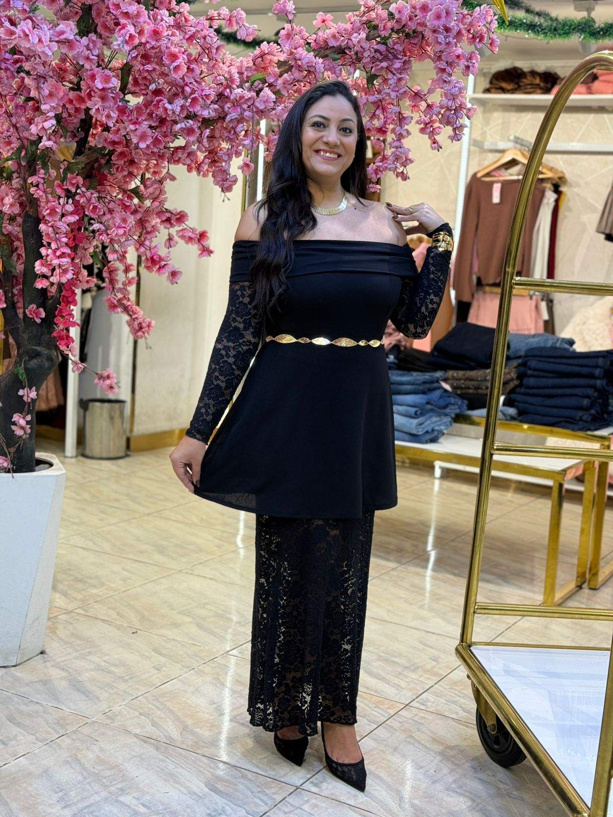 Black Off-shoulder Guipure Long Dress