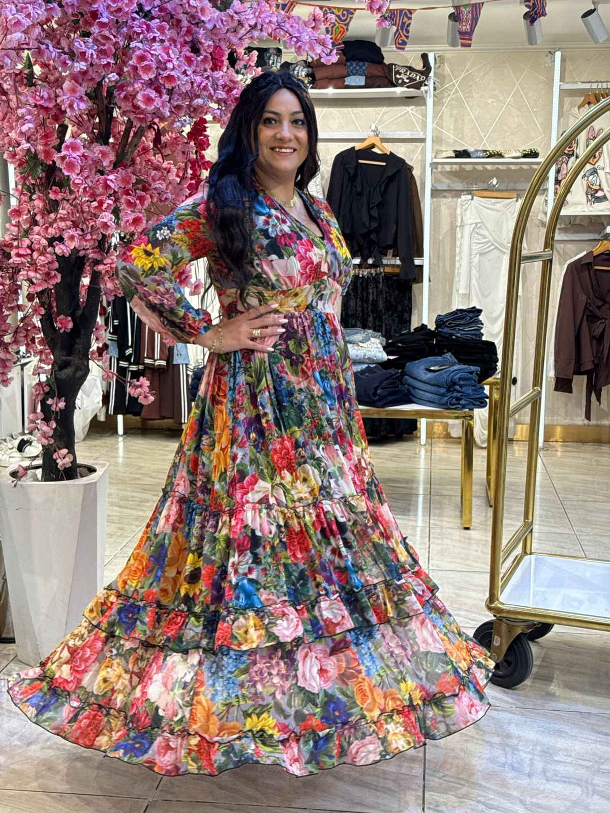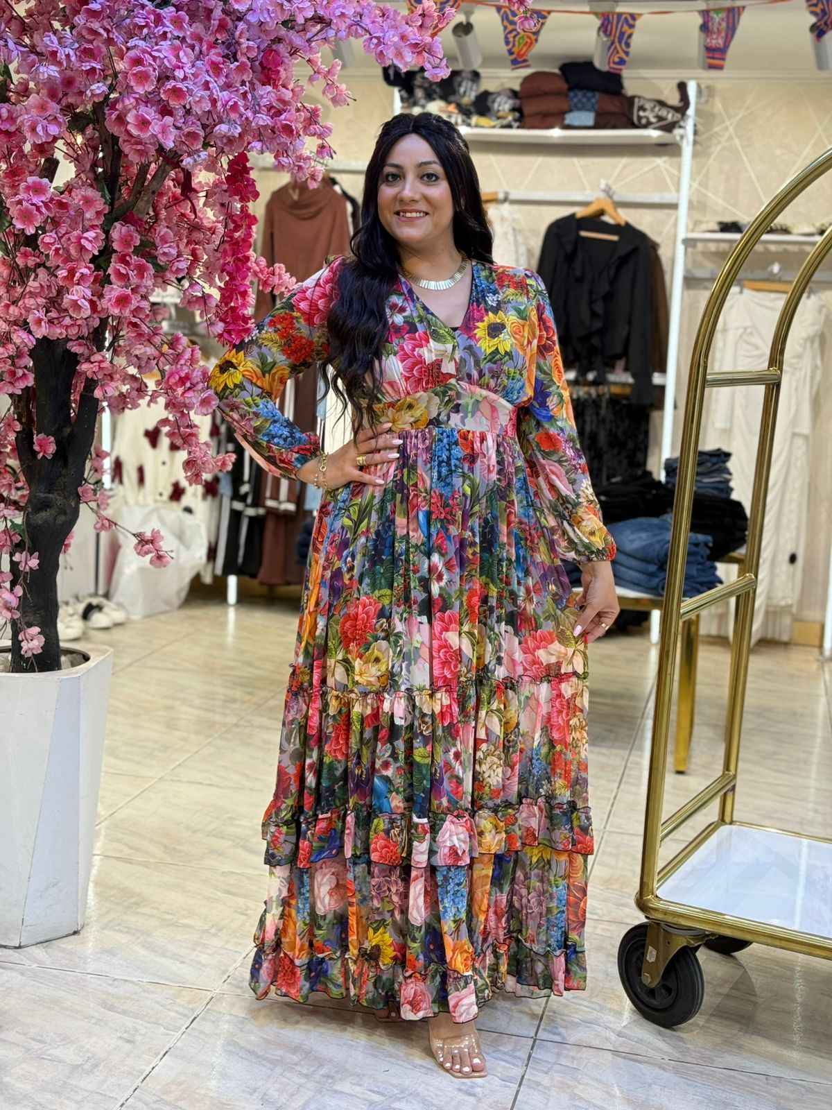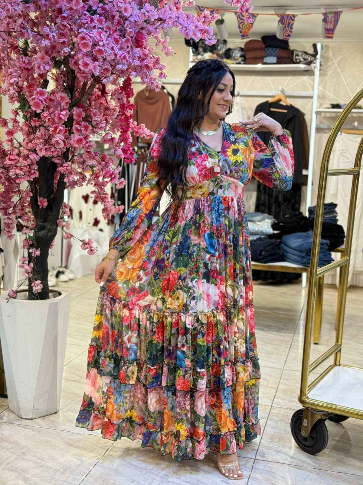 Long Sleeve Colorful Flowers Long Dress