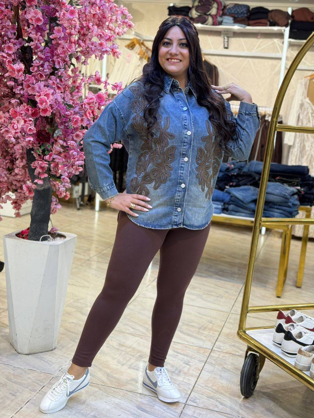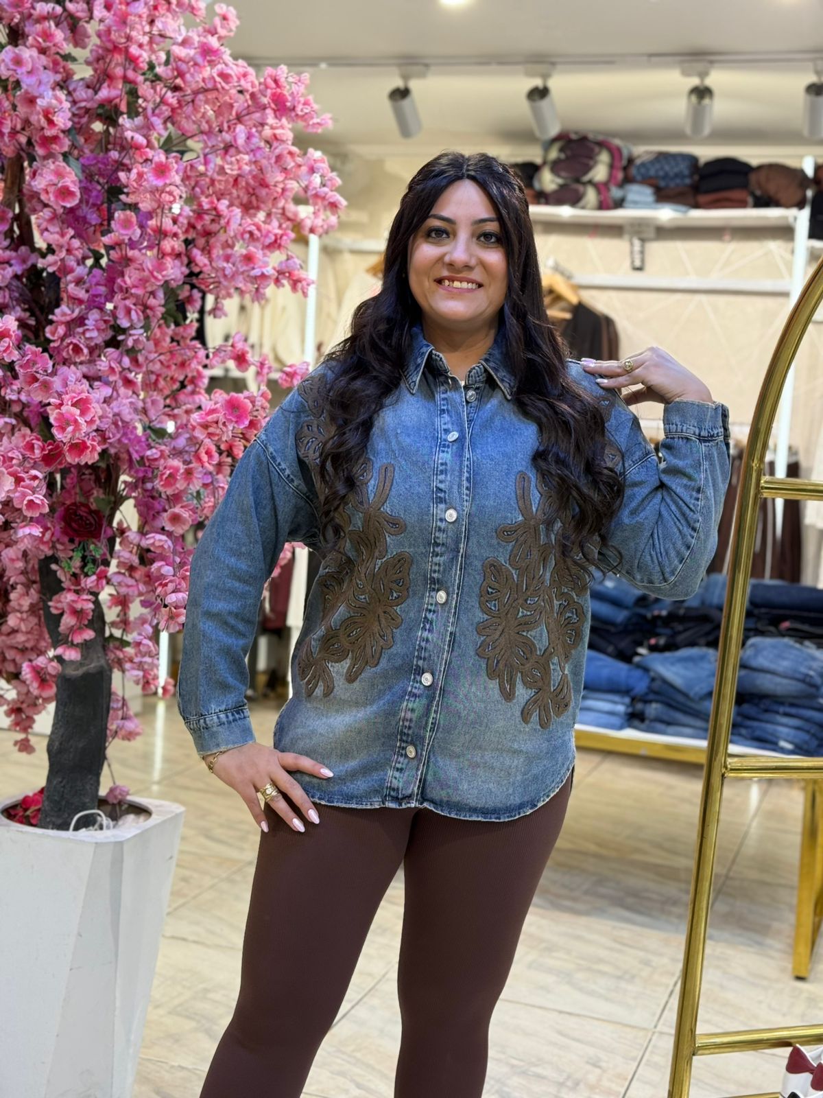 Long Sleeve Jeans Jacket with Brown Plaid