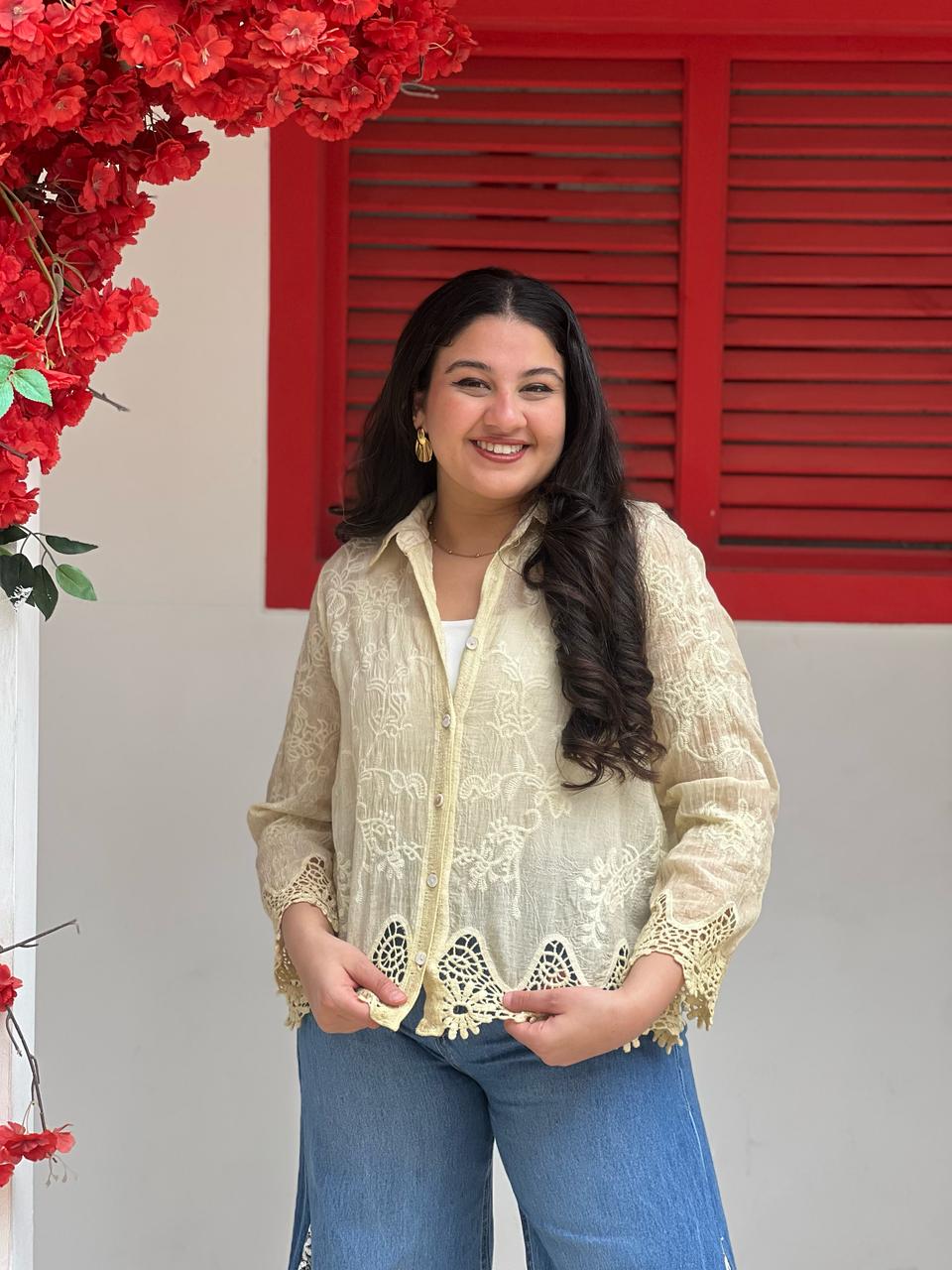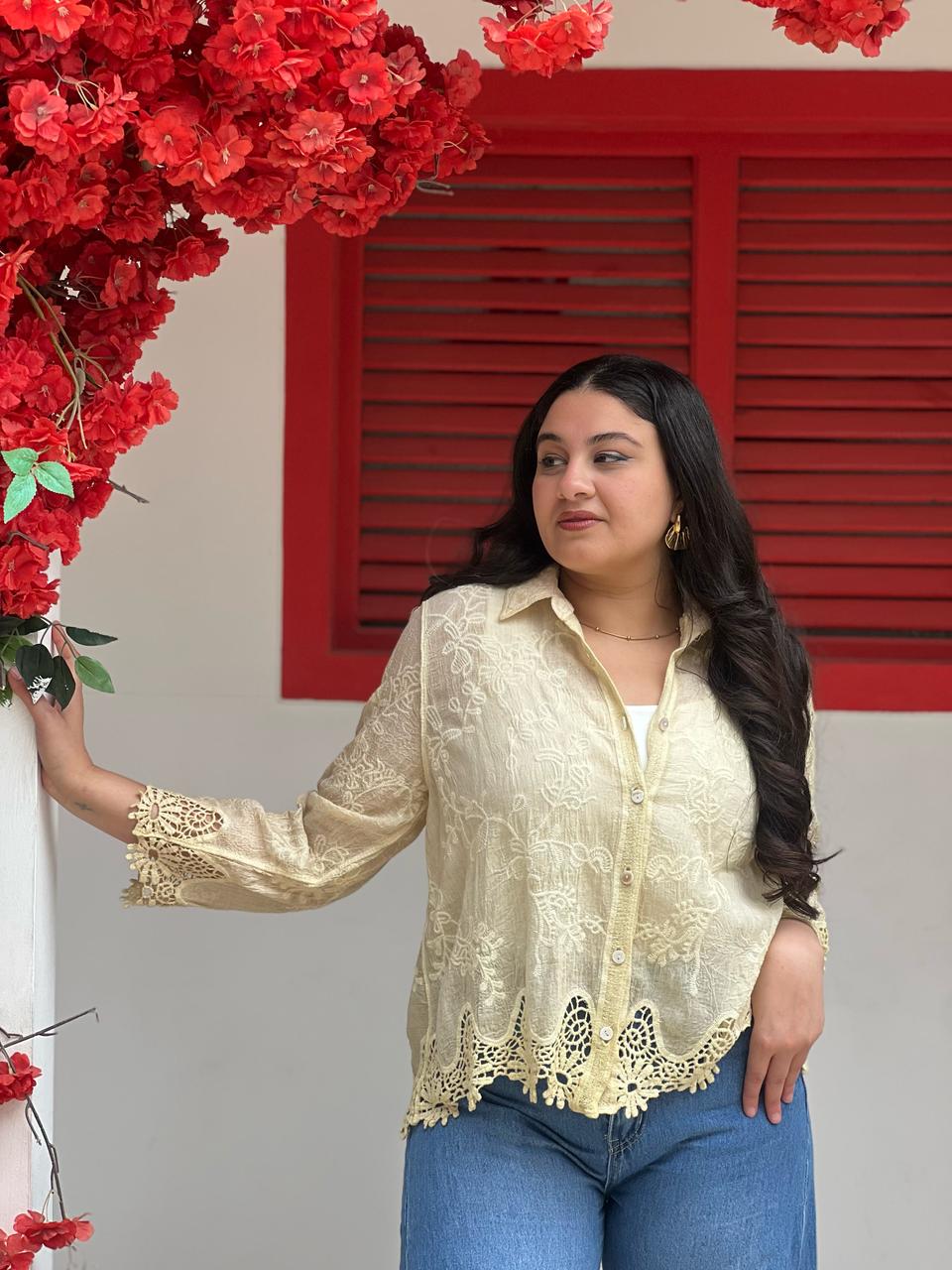 Velvet Blouse with a White Rose on The Chest