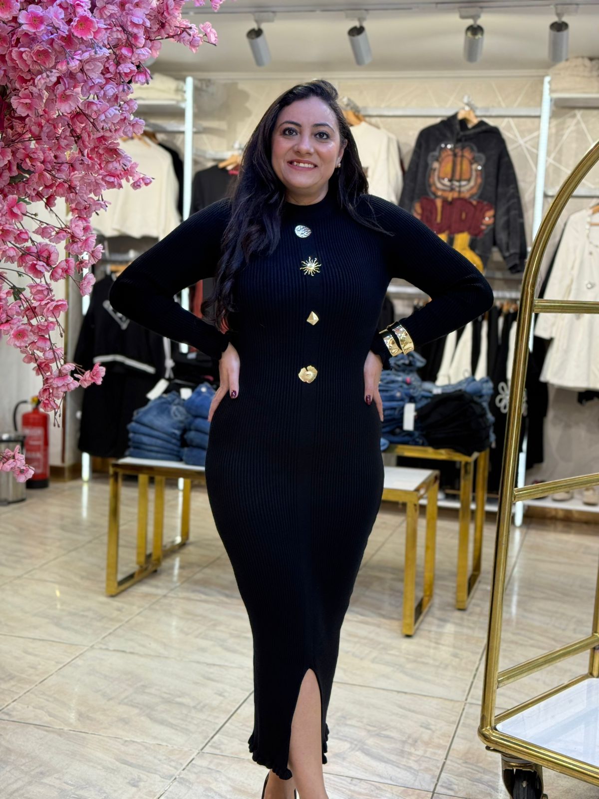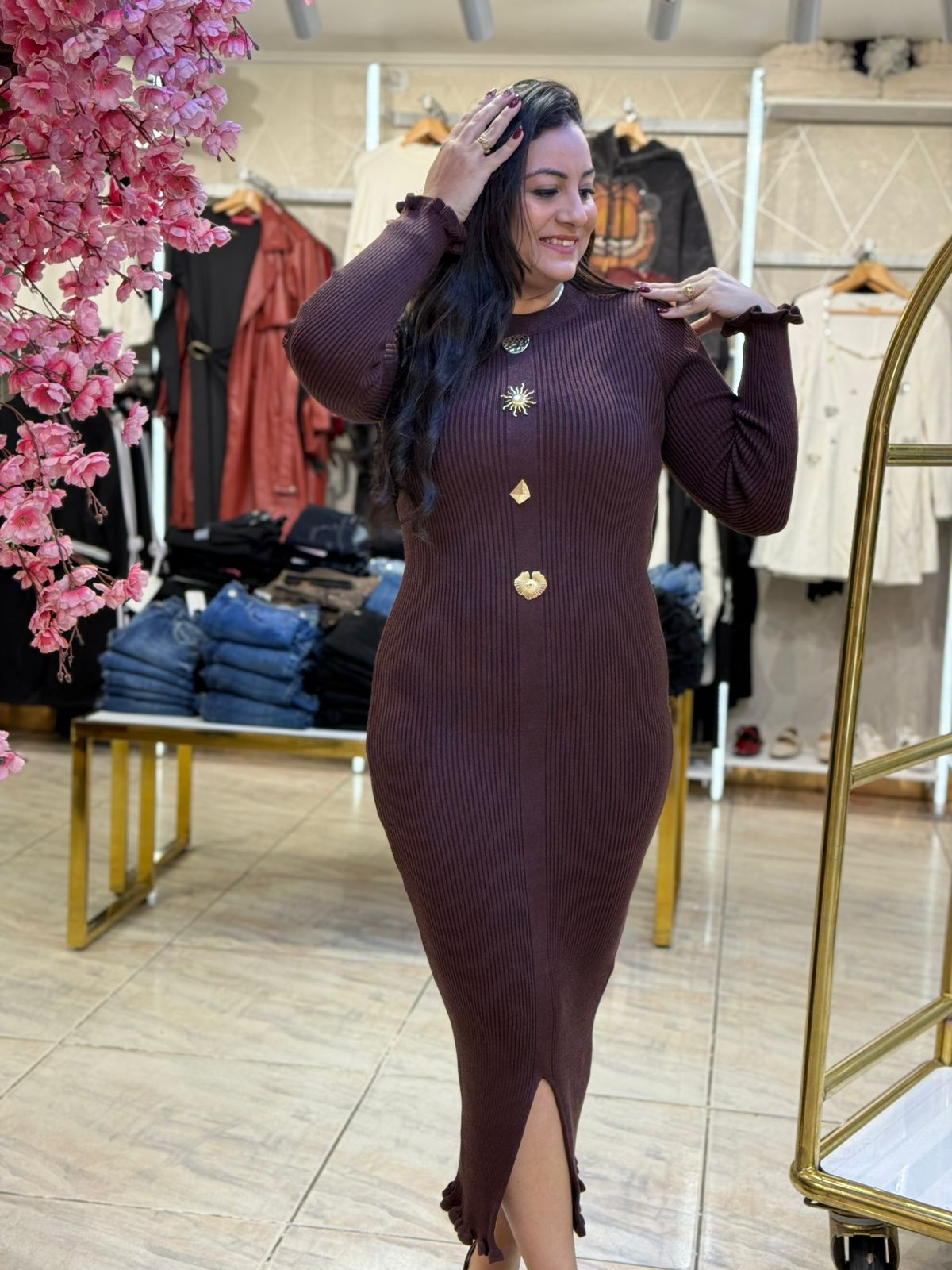 Plain Color Front Shapes Brooch Long Dress