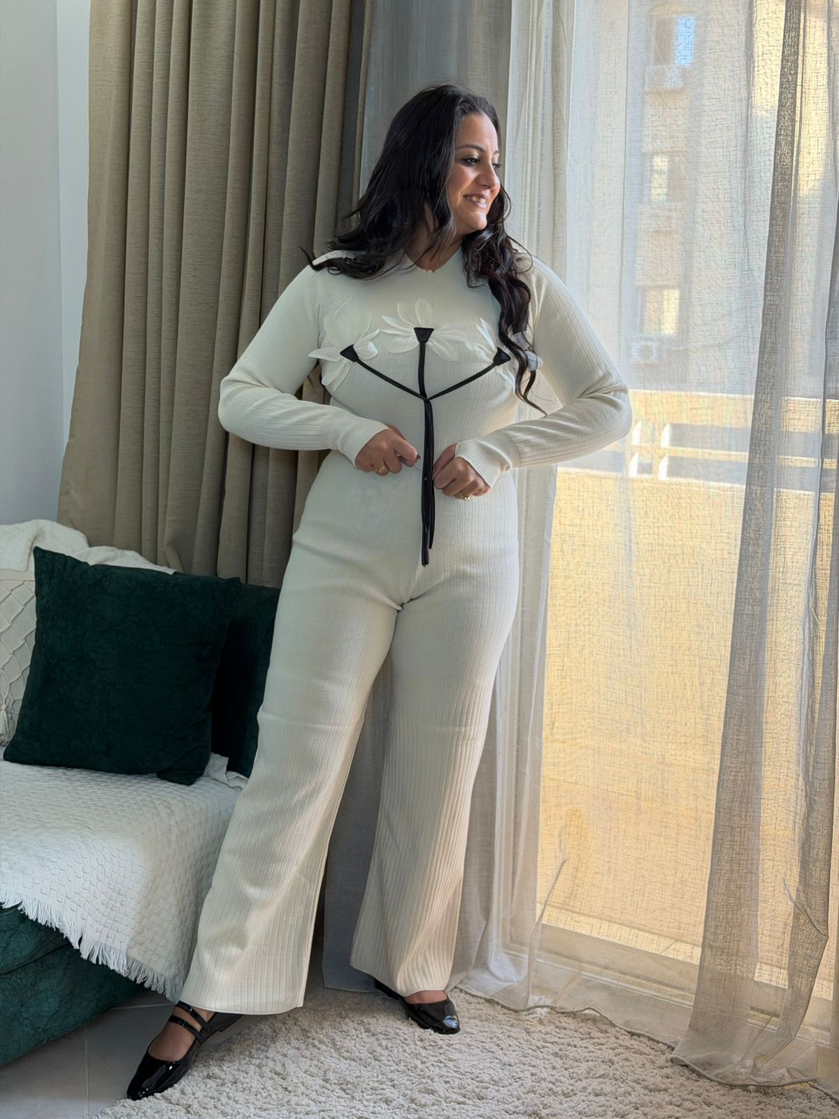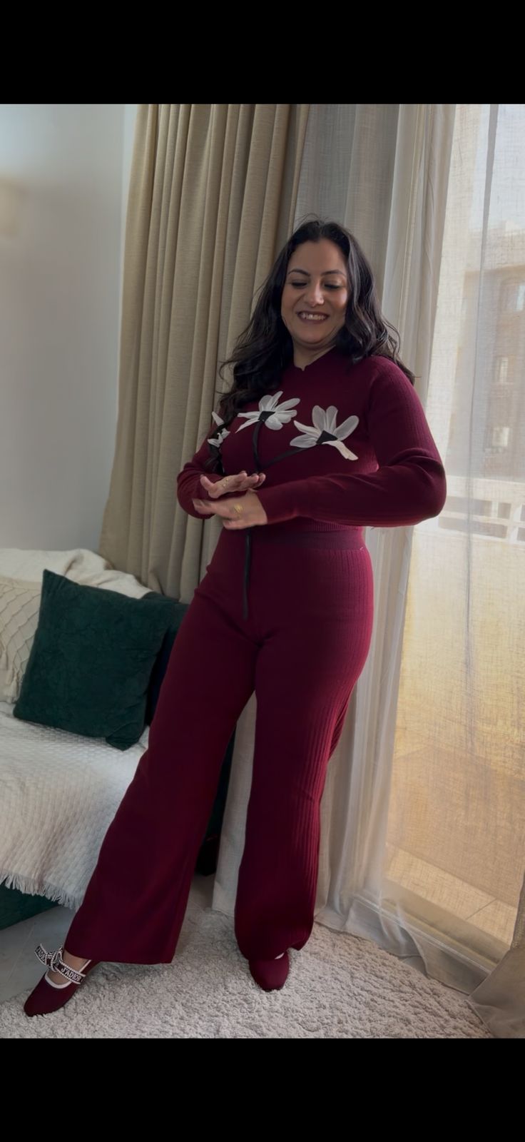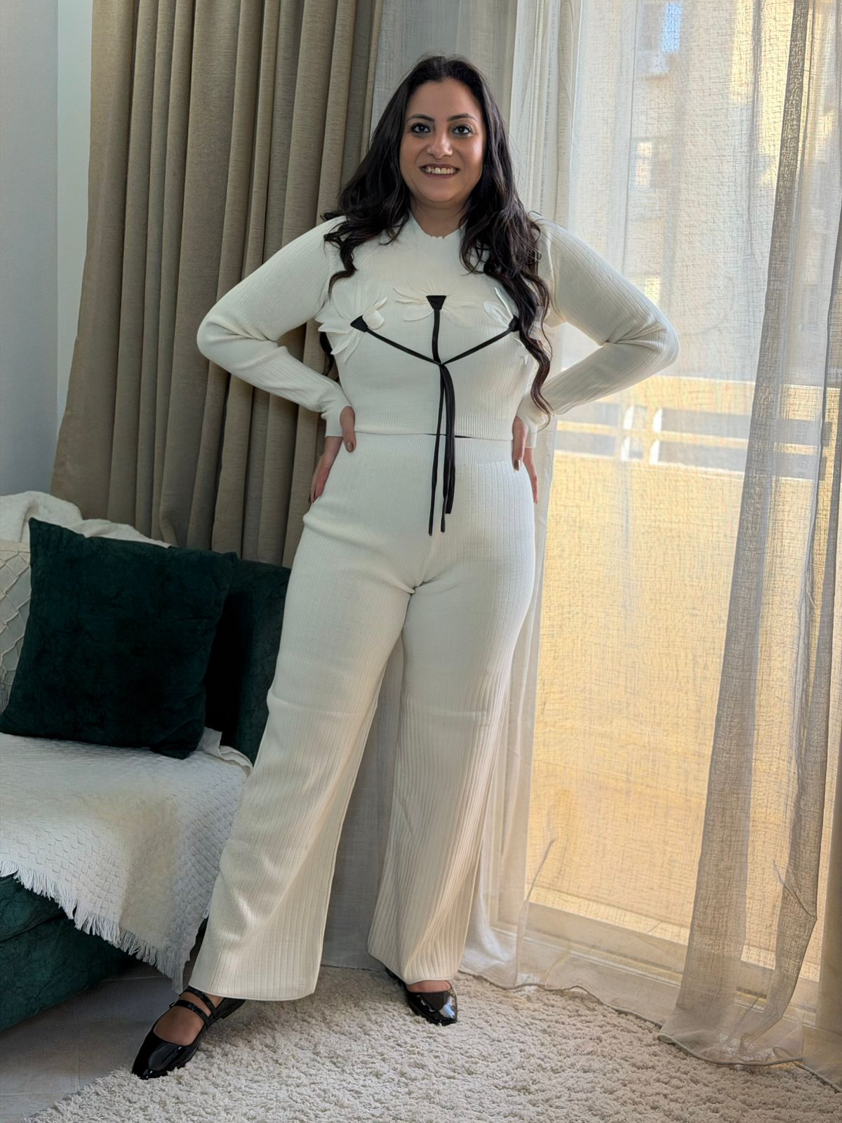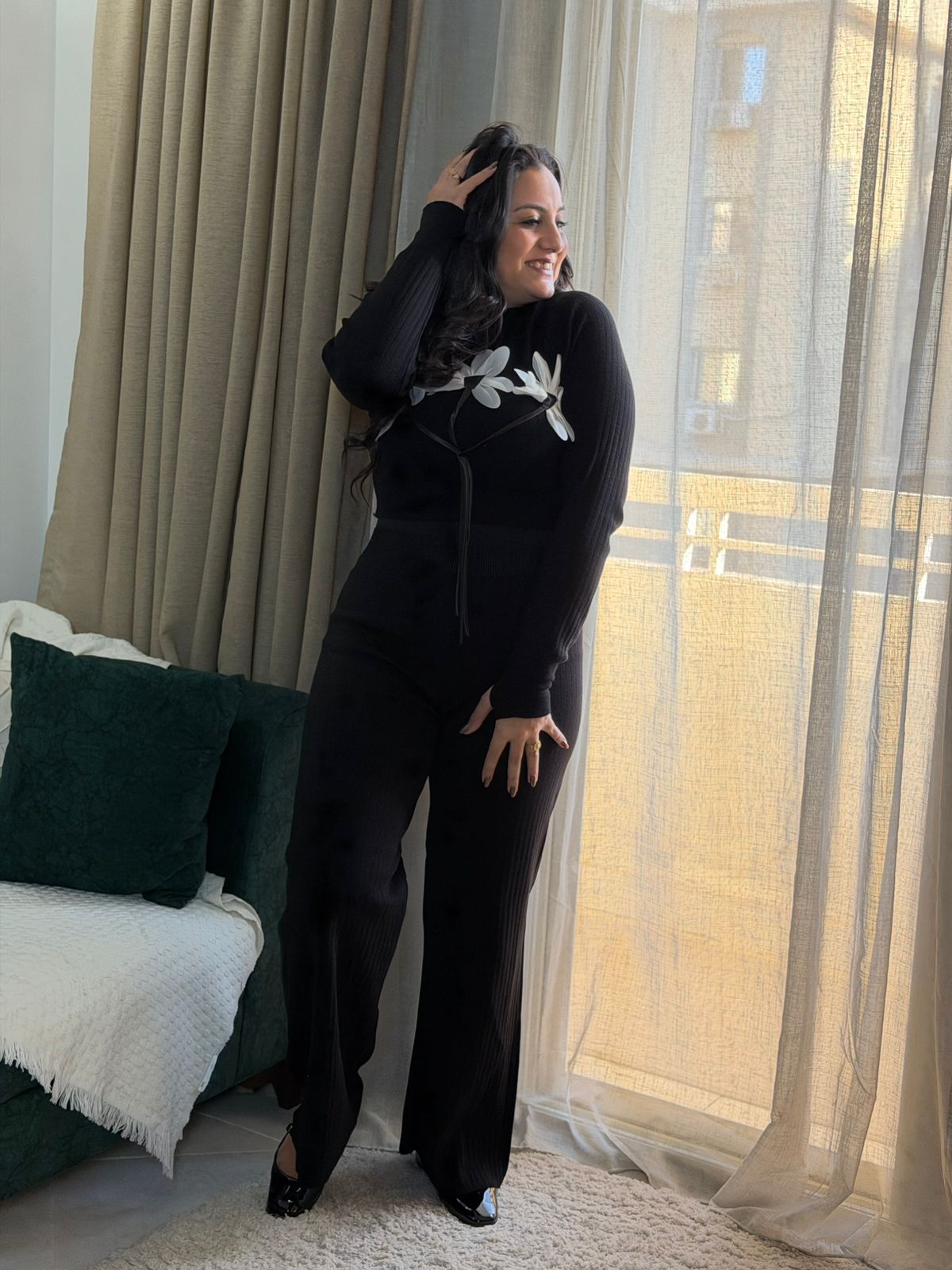 Set Two Pieces Front Flowers Long Sleeve Top & Wide Leg Pants